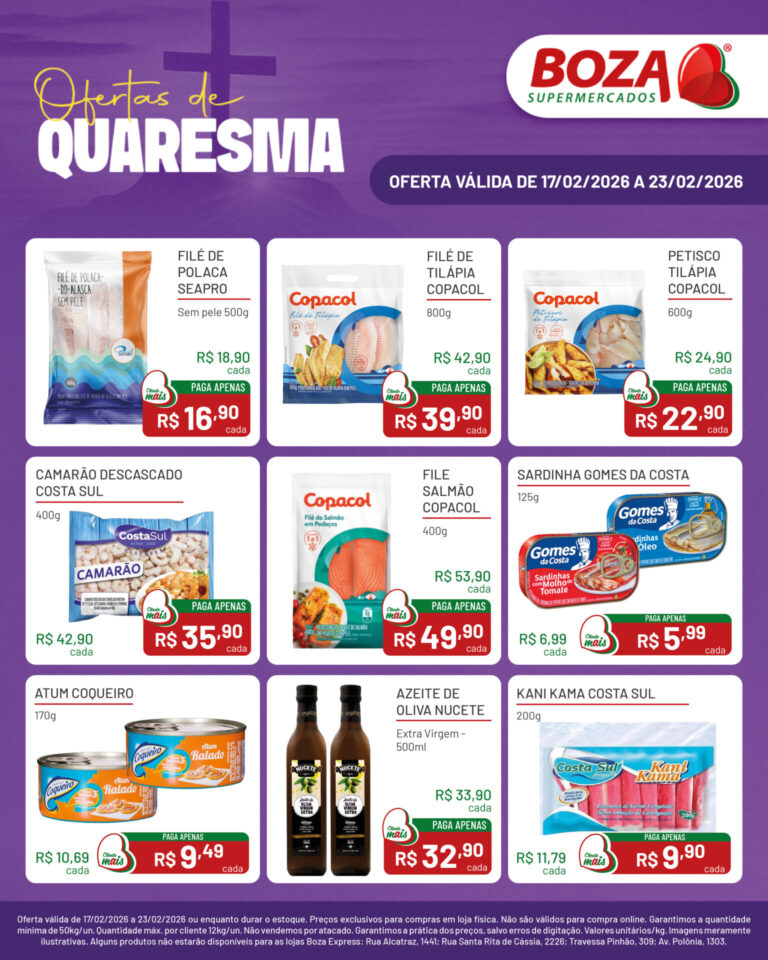 Alguns produtos não estarão disponíveis para as lojas Boza Express: Rua Alcatraz, 1441; Rua Santa Rita de Cássia, 2226; Travessa Pinhão, 309; Av. Polônia, 1303.